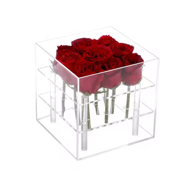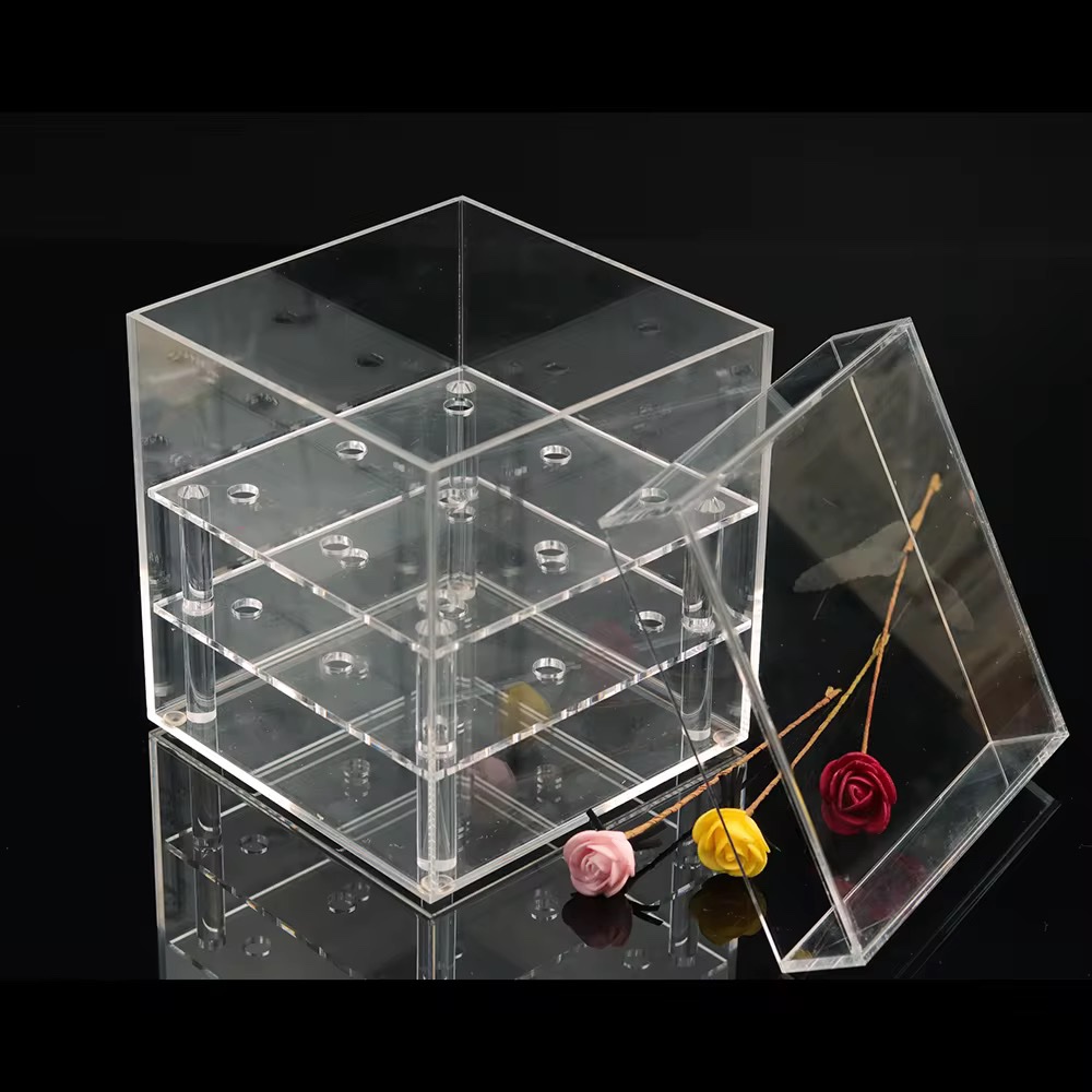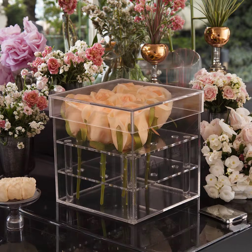 The 9 Holes Clear Acrylic Real Flower Gift Box is a modern and elegant way to present fresh flowers. Designed with nine individual compartments, it securely holds each bloom, allowing for stunning floral arrangements. Made from high-quality clear acrylic, the box showcases the beauty of the flowers while providing durability and a sleek appearance. Ideal for gifting on special occasions or as a charming centerpiece, this flower box combines practicality with a stylish aesthetic, making it a perfect choice for any floral enthusiast.