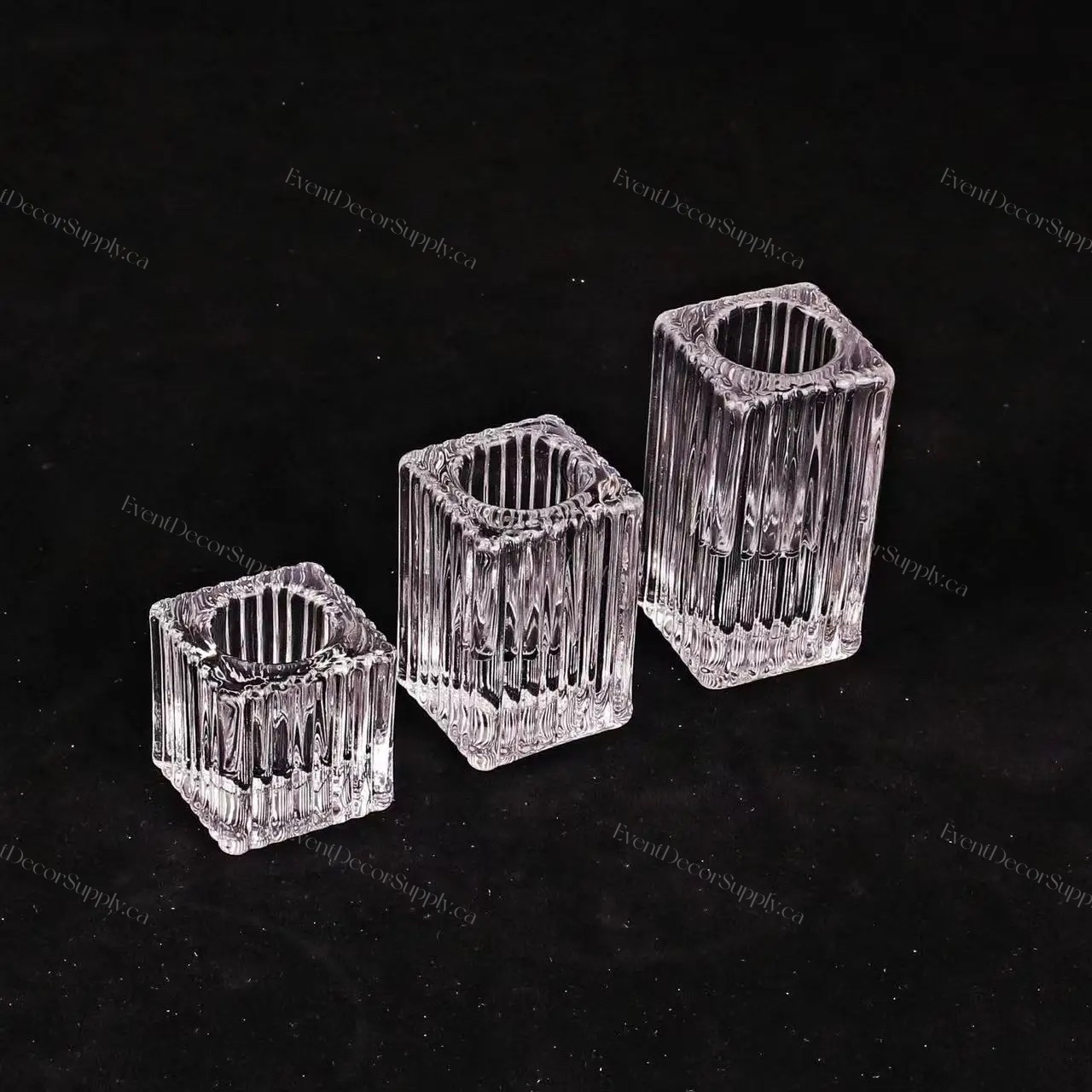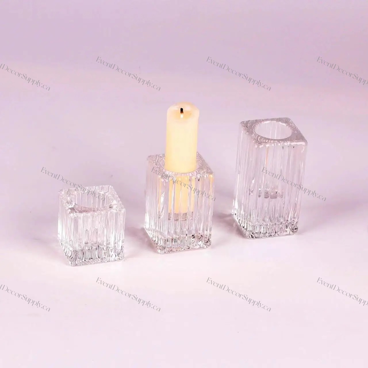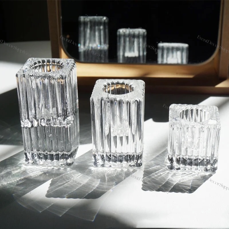 An exquisite collection designed to elevate your decor with timeless elegance. Perfect for both everyday use and special occasions, these candle holders come in three distinct sizes, allowing for a customizable display that suits any setting. Crafted from high-quality clear glass, they beautifully showcase the flickering candlelight, creating a warm and inviting atmosphere in any room.