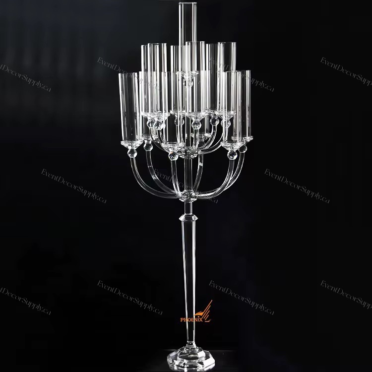 Elegant 13-arm crystal glass wedding centerpiece, designed to hold taper or pillar candles. Adds a luxurious, sparkling focal point for receptions, events, and upscale décor.
