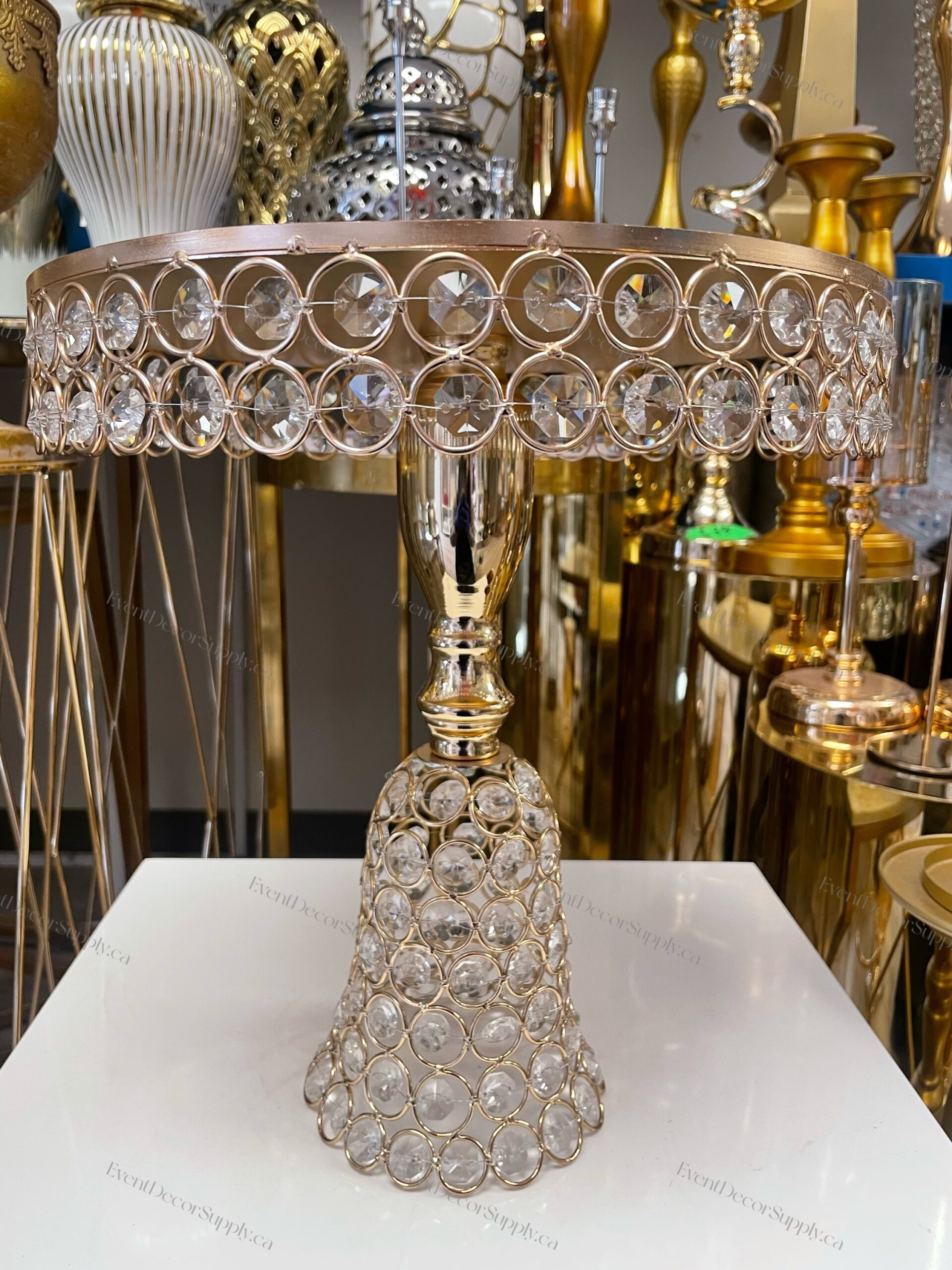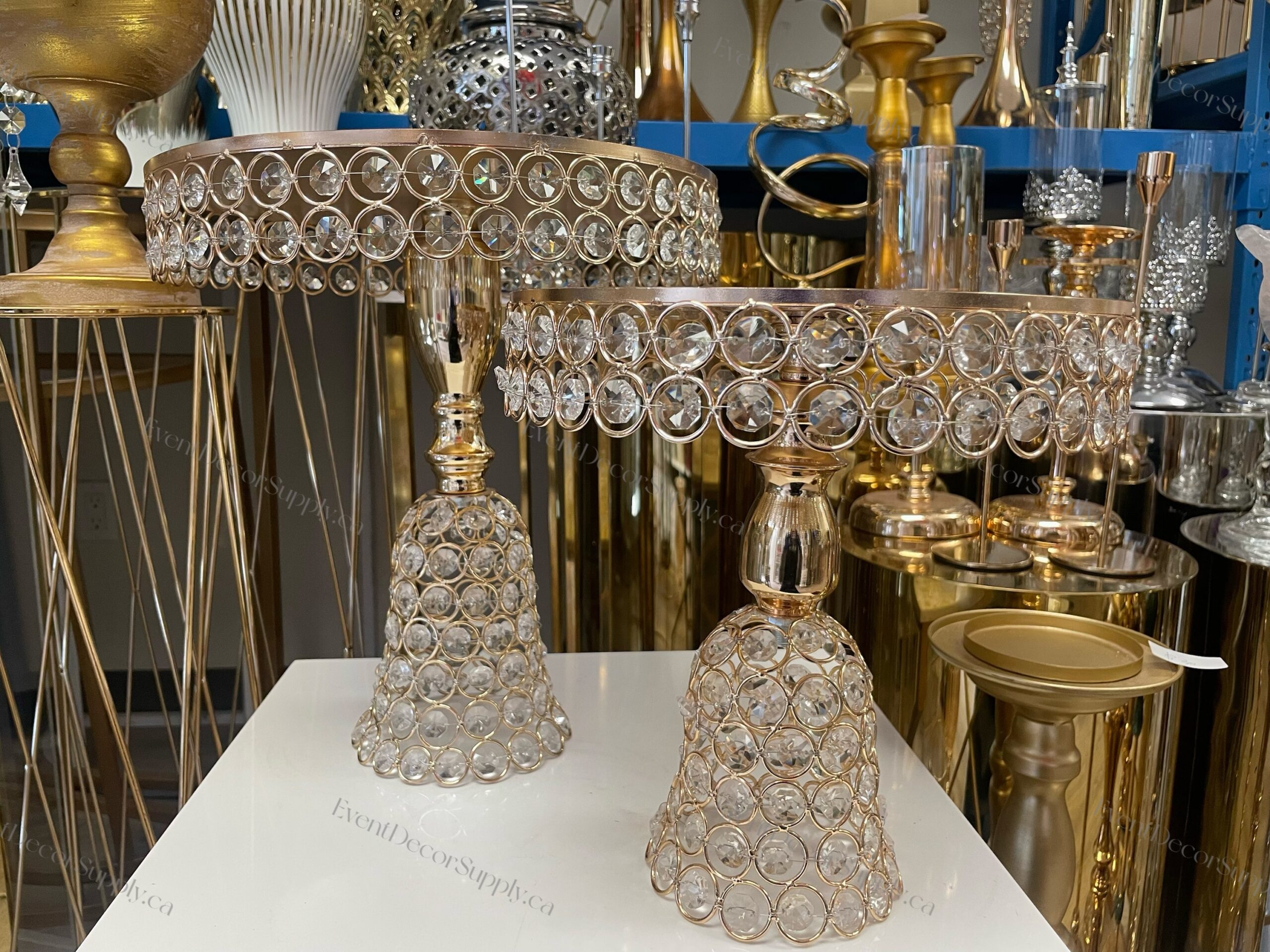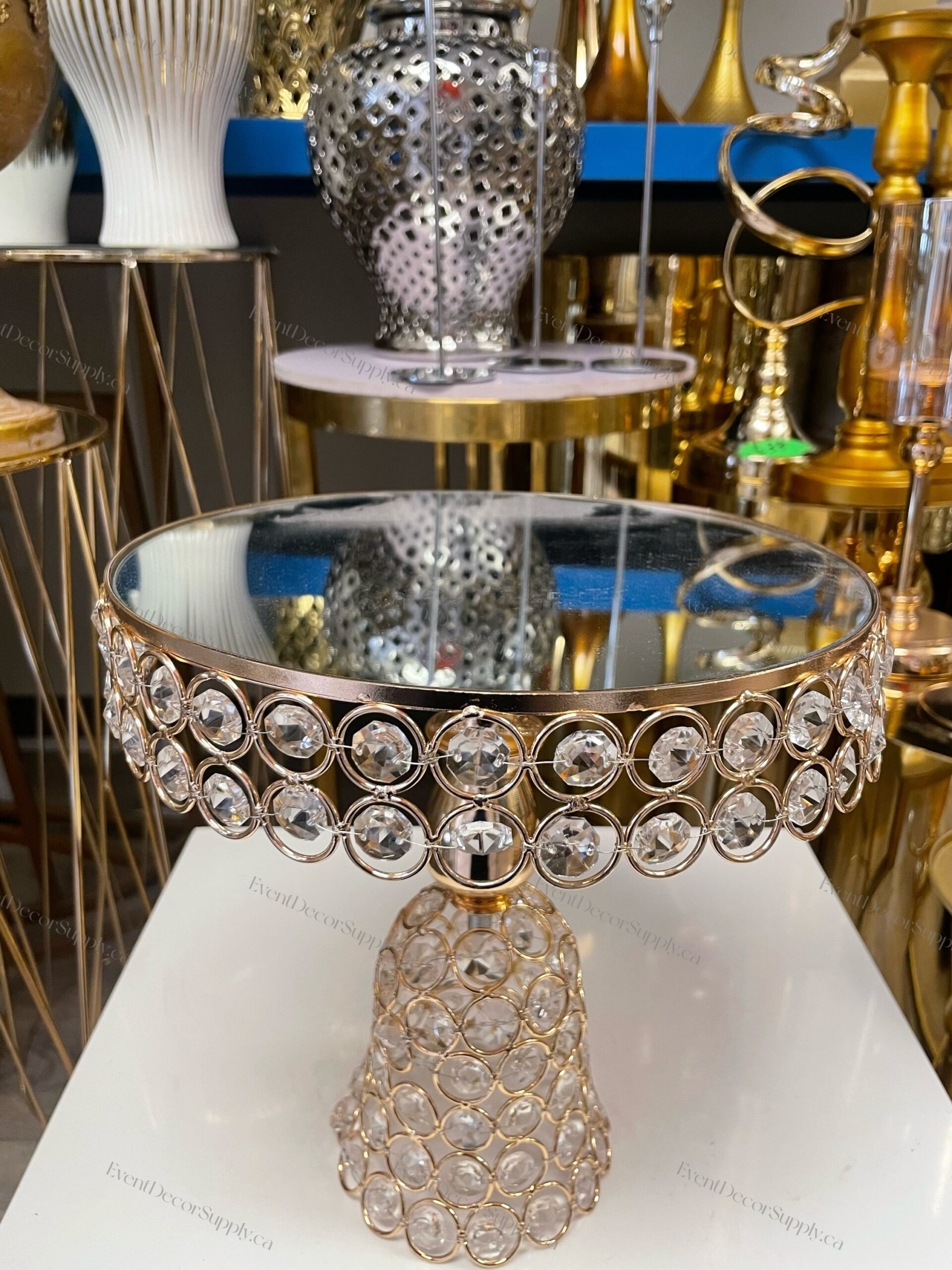 Gold crystal cake stands are elegant and luxurious serving pieces designed to showcase cakes, desserts, and other culinary delights. These stands typically feature a sturdy base and a raised platform, allowing for a beautiful presentation at celebrations, parties, or special occasions.