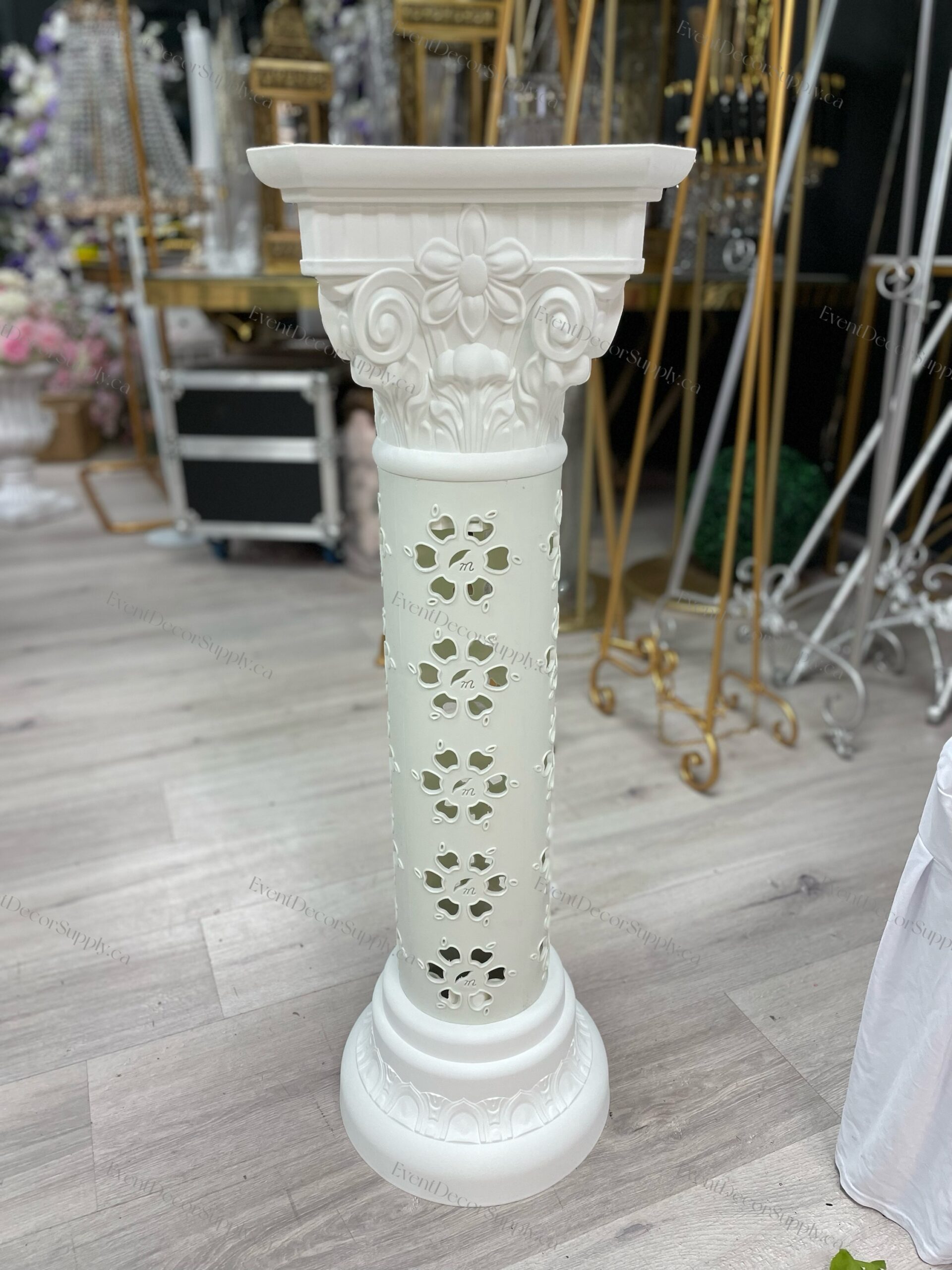 Plastic High-Quality Elegant White Roman Column Pedestal — a stylish and durable decorative stand designed for wedding events and floral arrangements. Made from high-quality plastic, it mimics the classic look of a Roman column with clean lines and an elegant white finish. Lightweight yet sturdy, it’s easy to set up and transport, making it ideal for displaying flowers, greenery, or other décor elements at ceremonies, receptions, photo backdrops, and other special occasions. Perfect for adding a timeless and sophisticated touch to your event design.