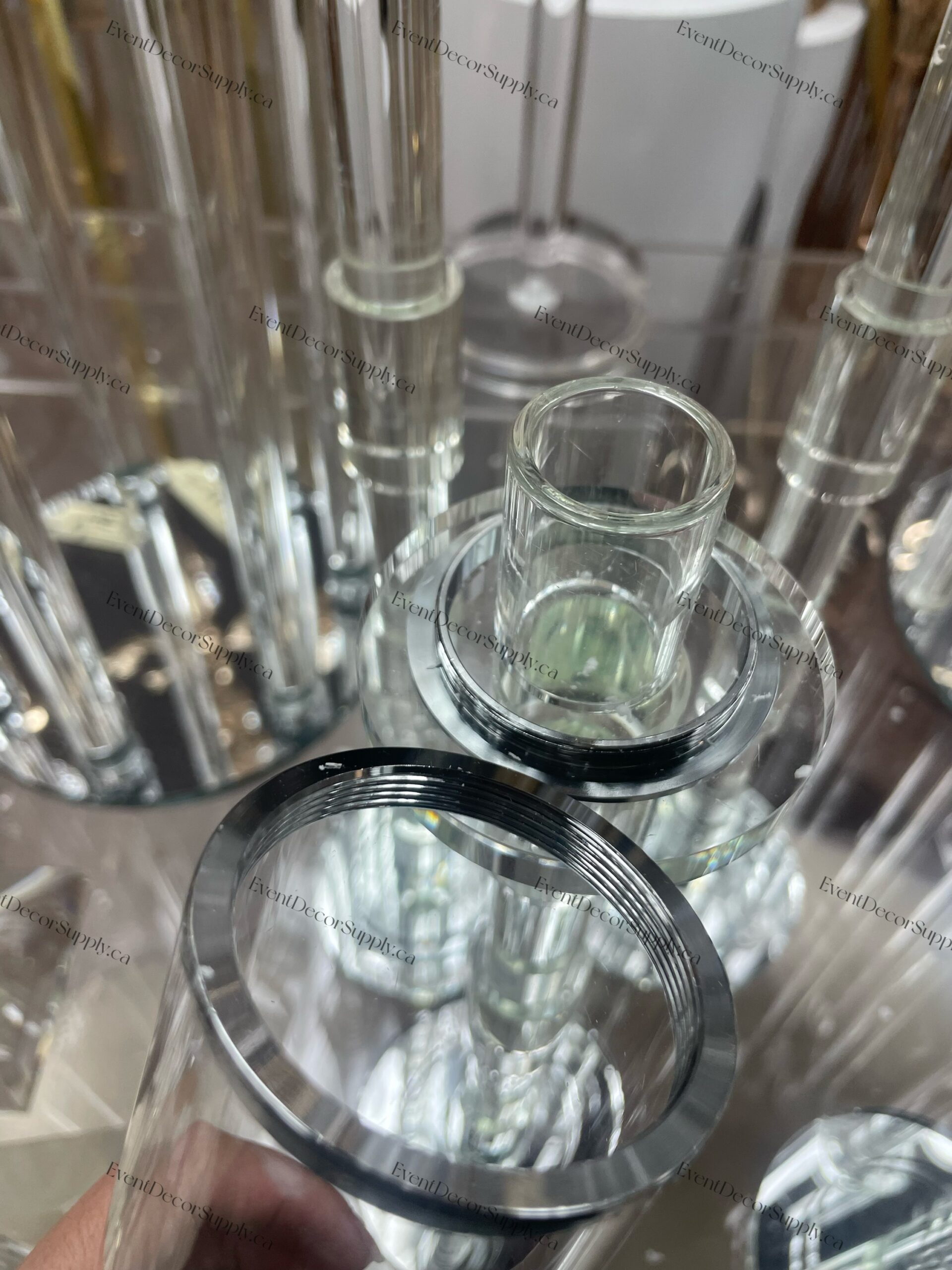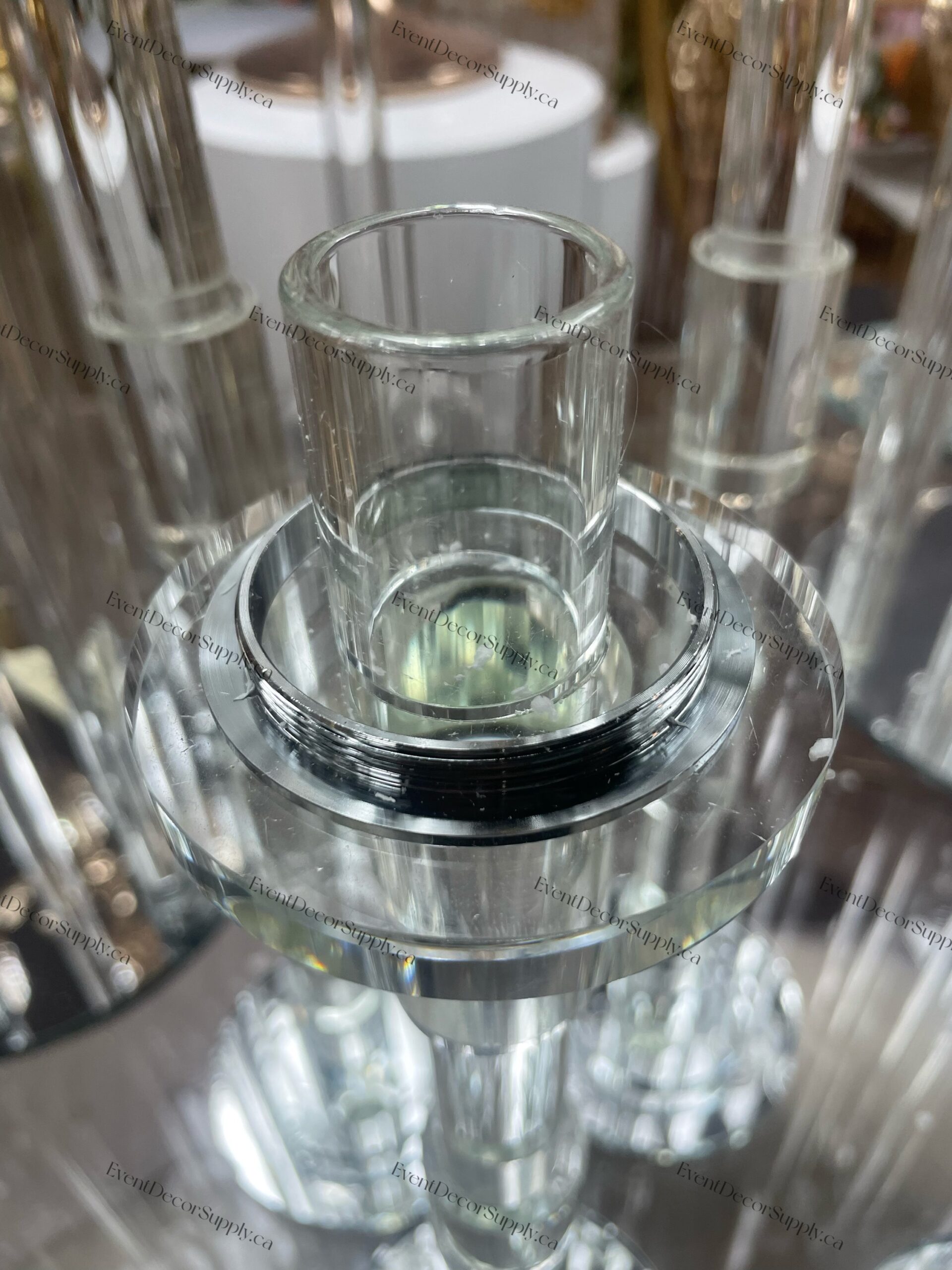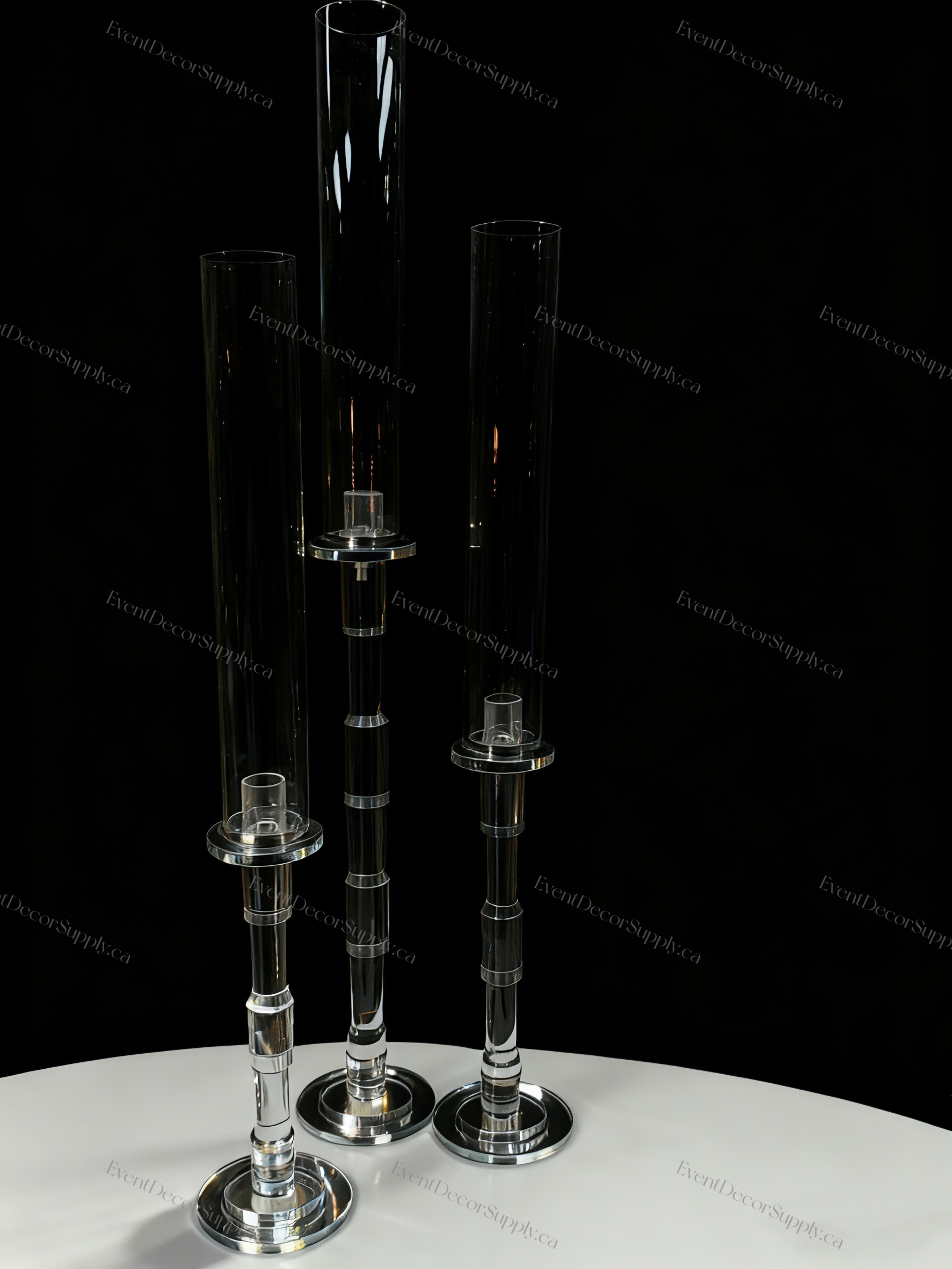 Elegant set of 3 tube glass crystal candlesticks designed for single candles, perfect for weddings, parties, and event centrepieces. The tube and holder connect through a twist-lock design, making the structure more stable and secure, reducing the risk of tipping. The clear glass and crystal accents beautifully reflect light, adding a touch of sophistication and sparkle to any setting. Stylish, sturdy, and ideal for enhancing your event décor.